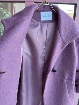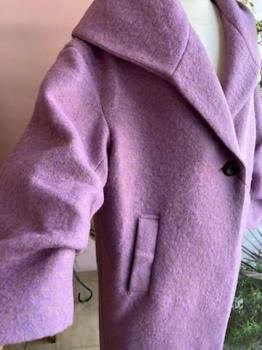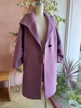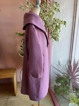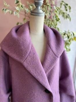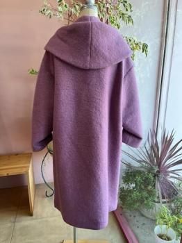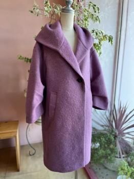 大きなフード風のショールカラーがアイコニックなセミロングコート。
